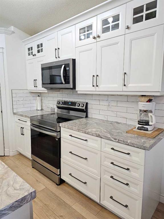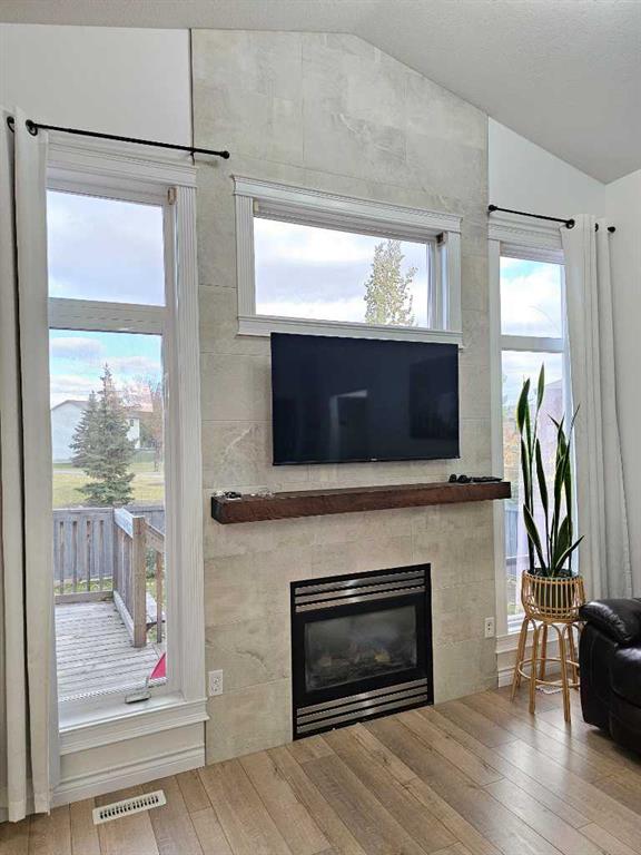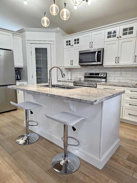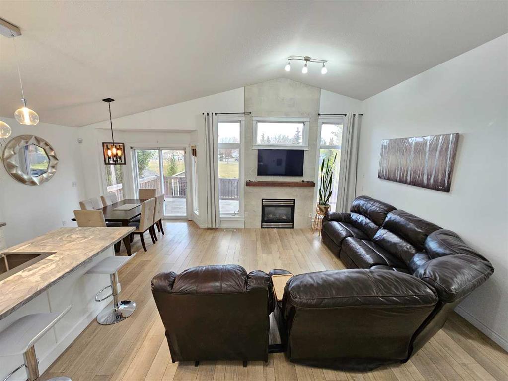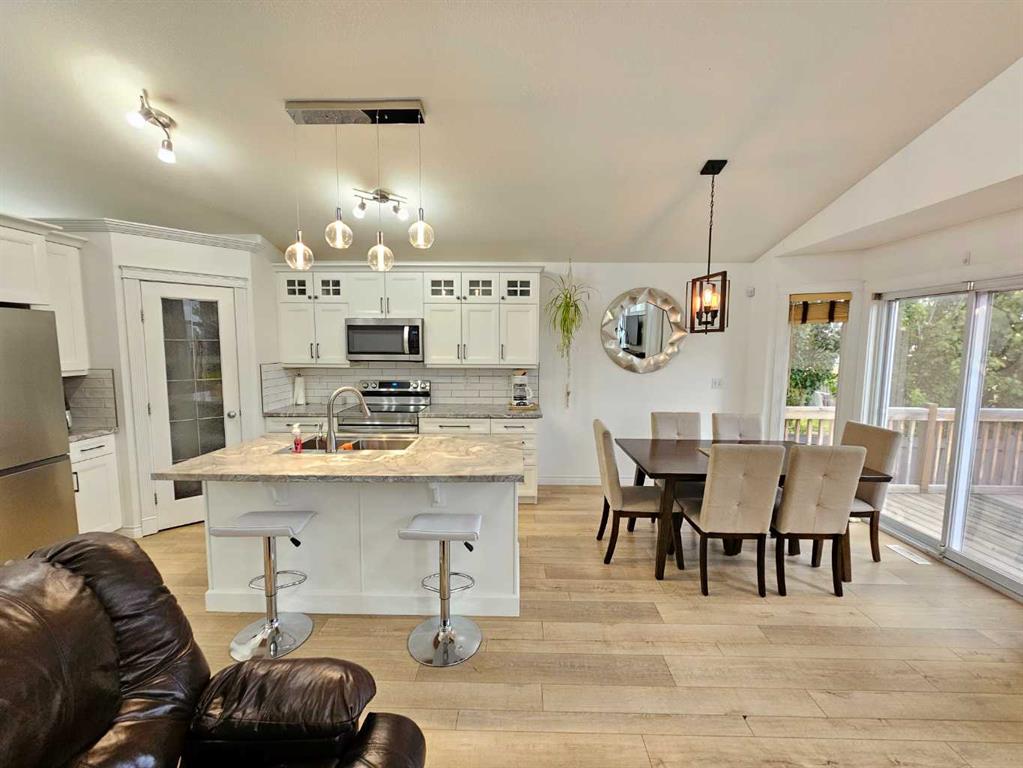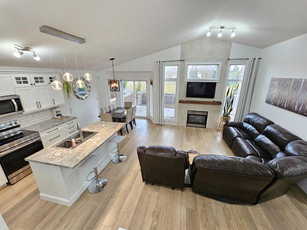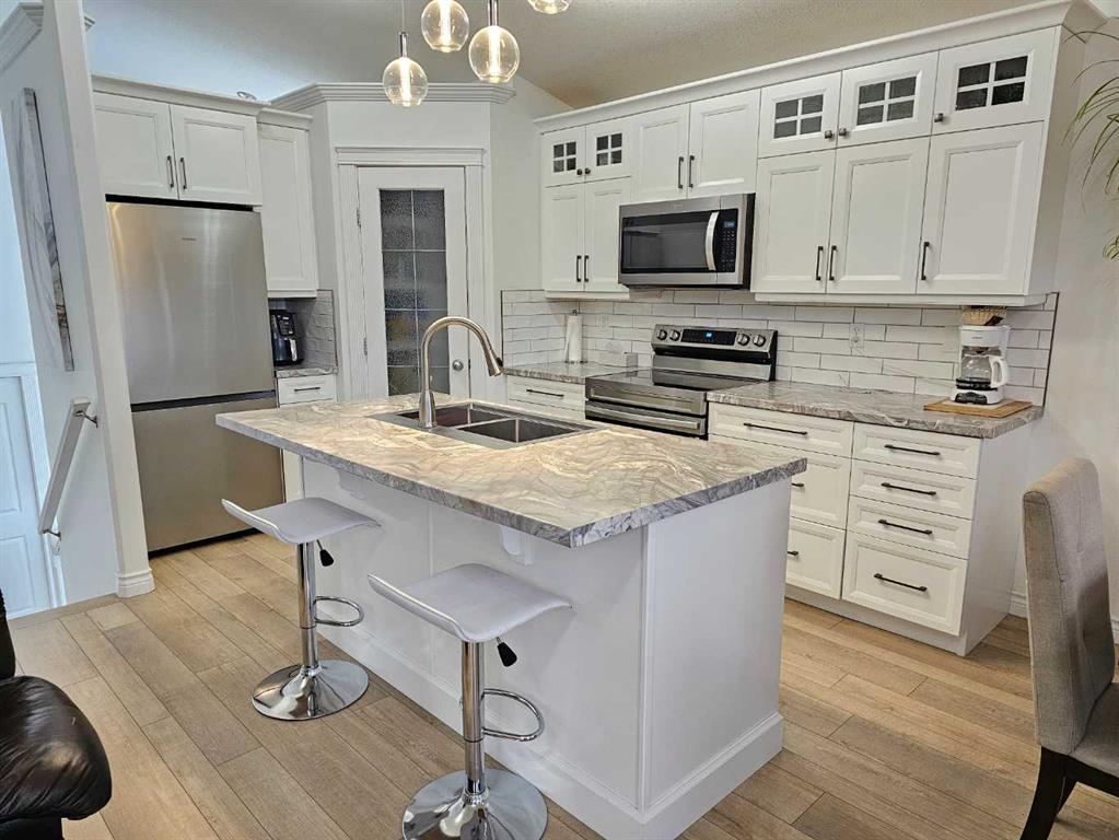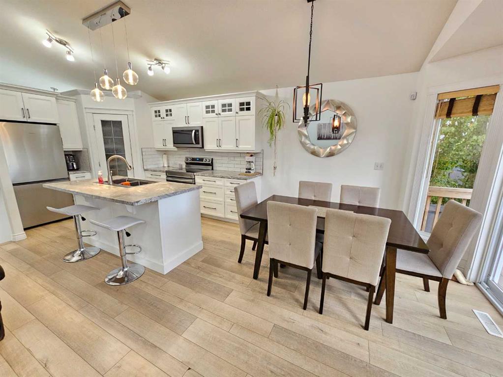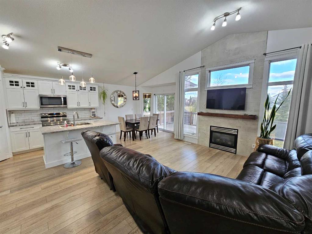 Beautifully renovated home in fantastic location backing onto large park with playground! This fabulous home has had some extensive updates over the last 5 years including a brand new kitchen and appliances, new water heater, new furnace, lovely new vinyl plank flooring and new paint! The main floor is completely redone with a stylish full bath as well. Nice open concept layout with a cozy fireplace in the living room and a large island in the kitchen, as well as 2 nice sized bedrooms. Dining area leads out...